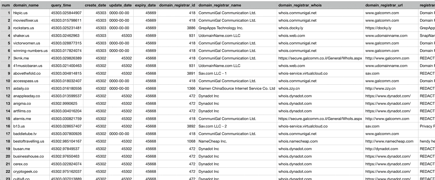 A daily dump of all newly created domains on the Internet—essentially a list of newly registered companies. You’ll receive over 100,000 fresh leads each day, including details such as location, phone numbers, emails, domain names, registration dates, and more. It’s ideal for identifying new businesses as they appear online and generating leads for services like SEO, marketing, web development, WordPress websites, content creation, and more.